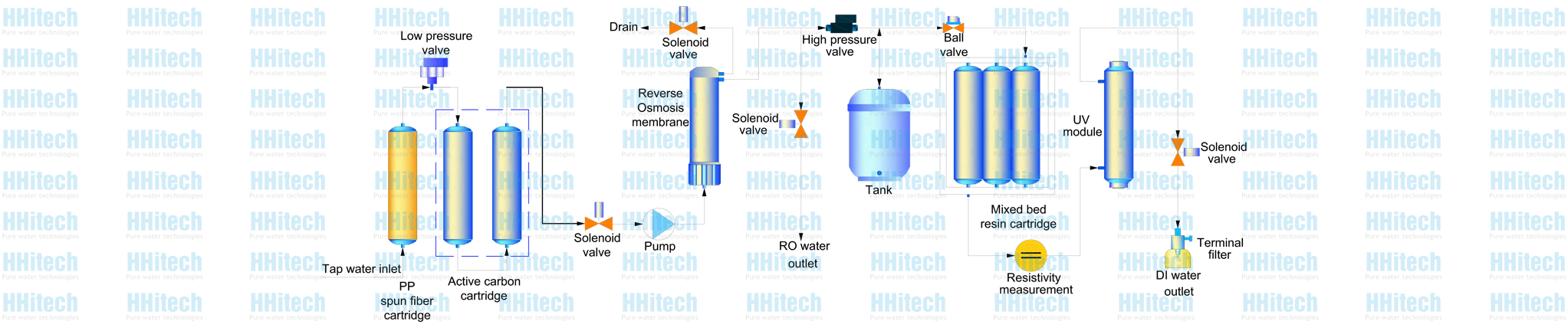 Standard configuration Main body (Including 1 set of cartridge)+15 liters pressure tank+ TDS/conductivity test pen