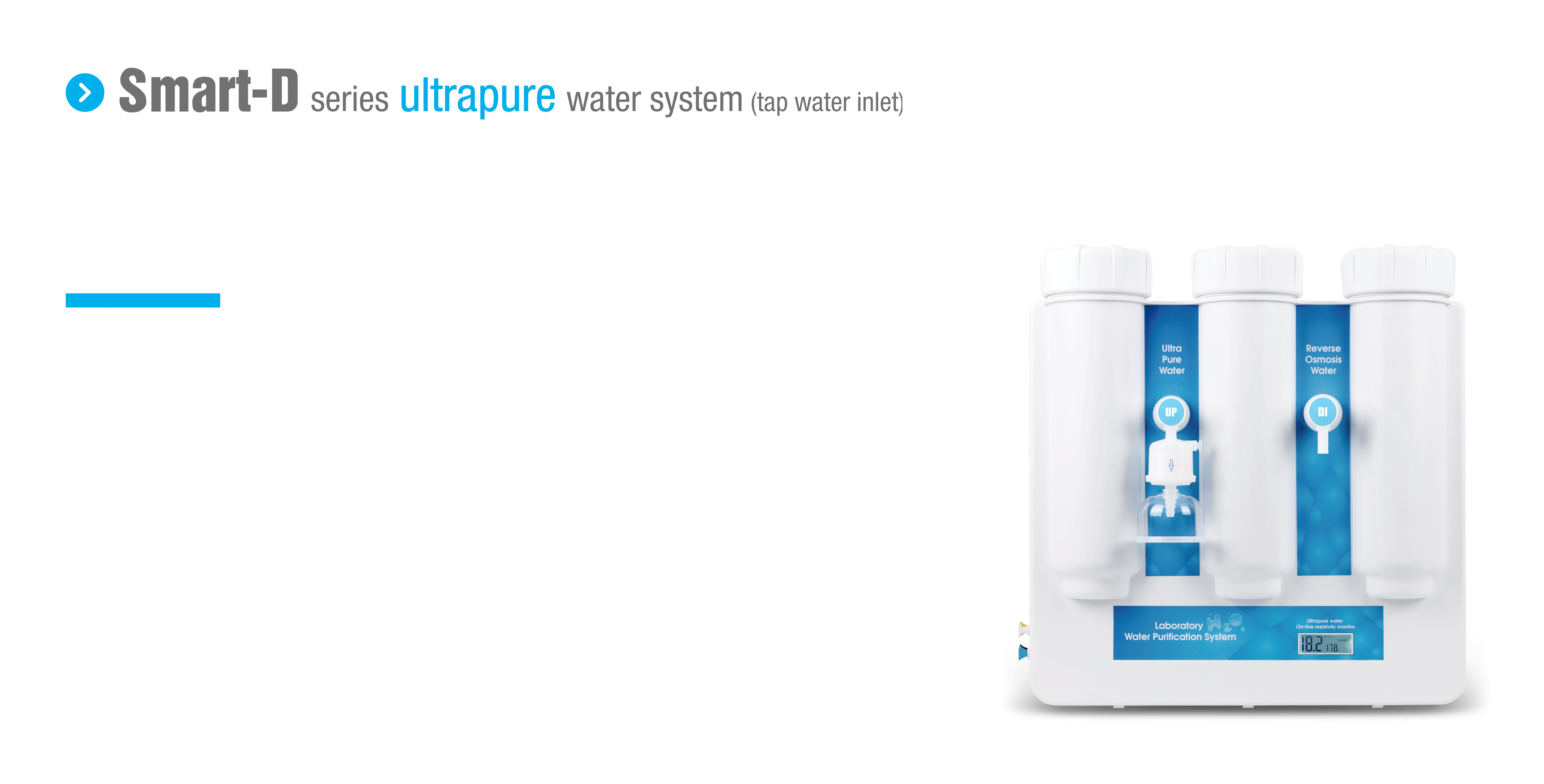 With injection molding process case, 1 pump, portable TDS test pen and on-line resistivity monitor, Smart-D series ultrapure water system is sub-economic choice of ultrapure water for high grade experiments.