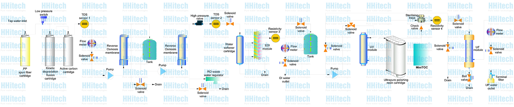 Double wavelength (185&254nm) ultraviolet lamp module, restrain bacteria´s increase and reduce TOC.