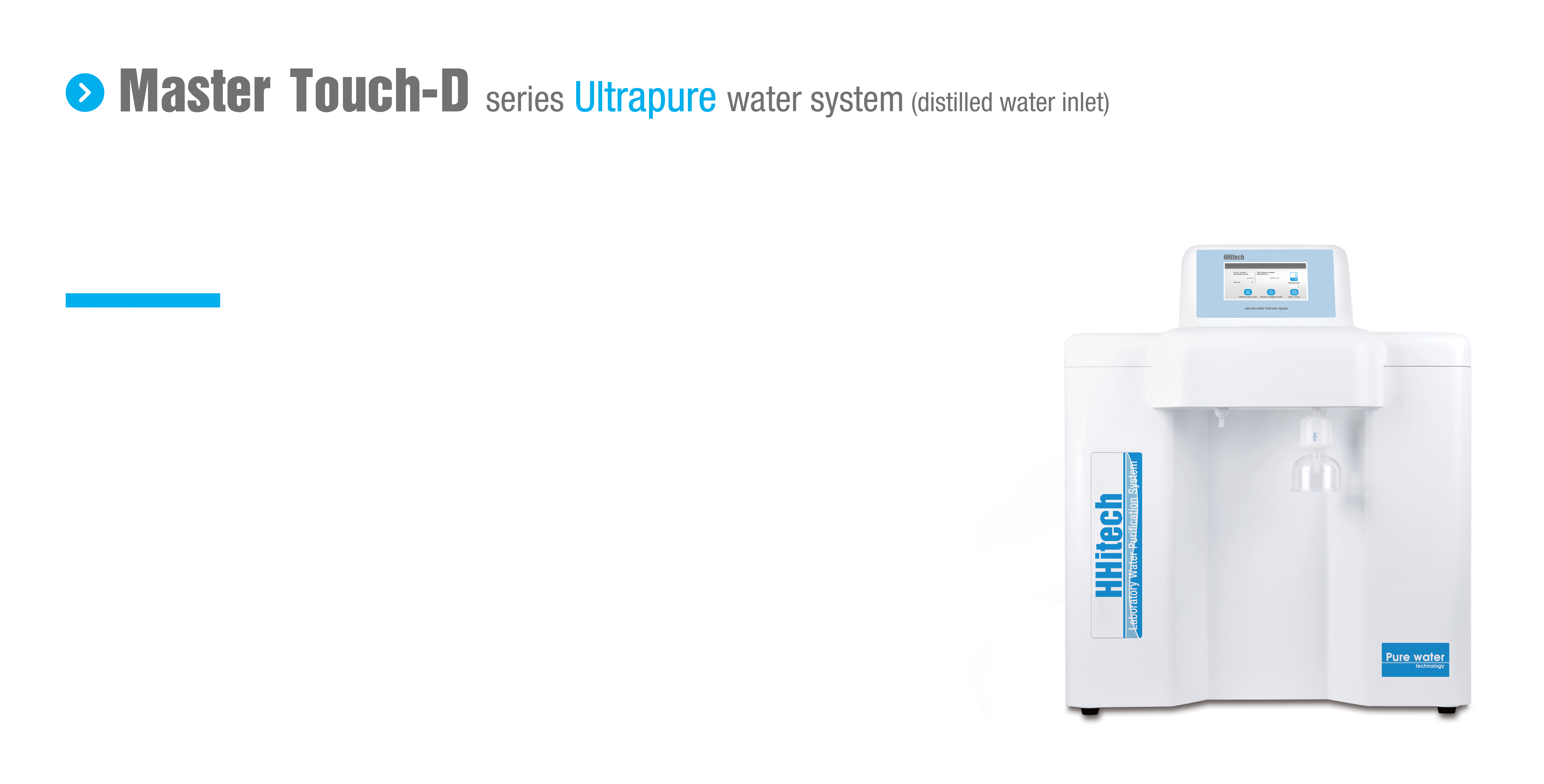 With 5.0 inch touch screen system, 3 way water quality sensor, 2 way flow sensor for quantified dispensing and 1 pump, Master Touch-D series ultrapure water system is superior choice of ultrapure water for high grade experiments. With pure water or distilled water inlet, its output is up to 2 liters/minute. It can produce deionized water and ultrapure water. The deionized water’s resistivity is above 5MΩ.cm, and the ultrapure water’s resistivity absolutely reaches to 18.2MΩ.cm. It completely meets the highest grade I standard of ASTM, CAP, CLSI, EP and USP.
